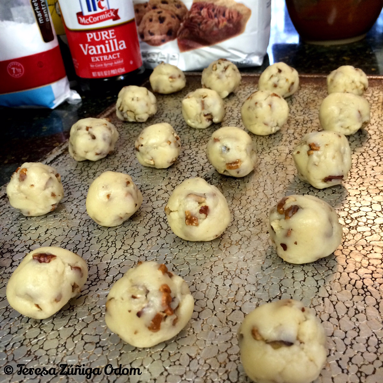 Here is my mother’s recipe: 1 cup butter or margarine; 1/2 cup sifted confectioners sugar; 1 tsp. vanilla; 2-1/4 cups of all-purpose flour (do not use self-riding flour); 1/4 tsp. salt, and 3/4 cups finely chopped nuts (I use pecans). Mix butter, sugar and vanilla thoroughly. Measure flour by dipping method or by sifting. Stir flour and salt together; blend in. mix in nuts. Chill dough.