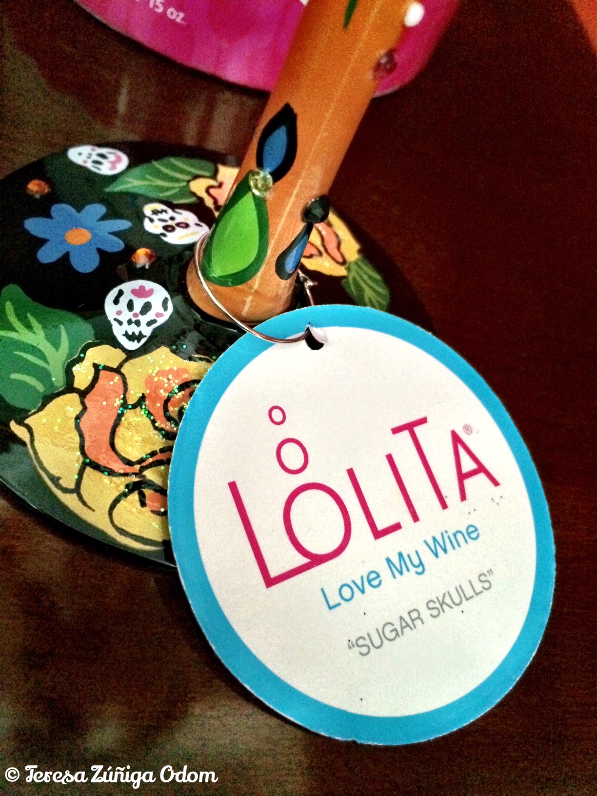 One side of the Lolita glass has a male sugar skull face on it and the other side has a female face. LOVE these wine glasses!
