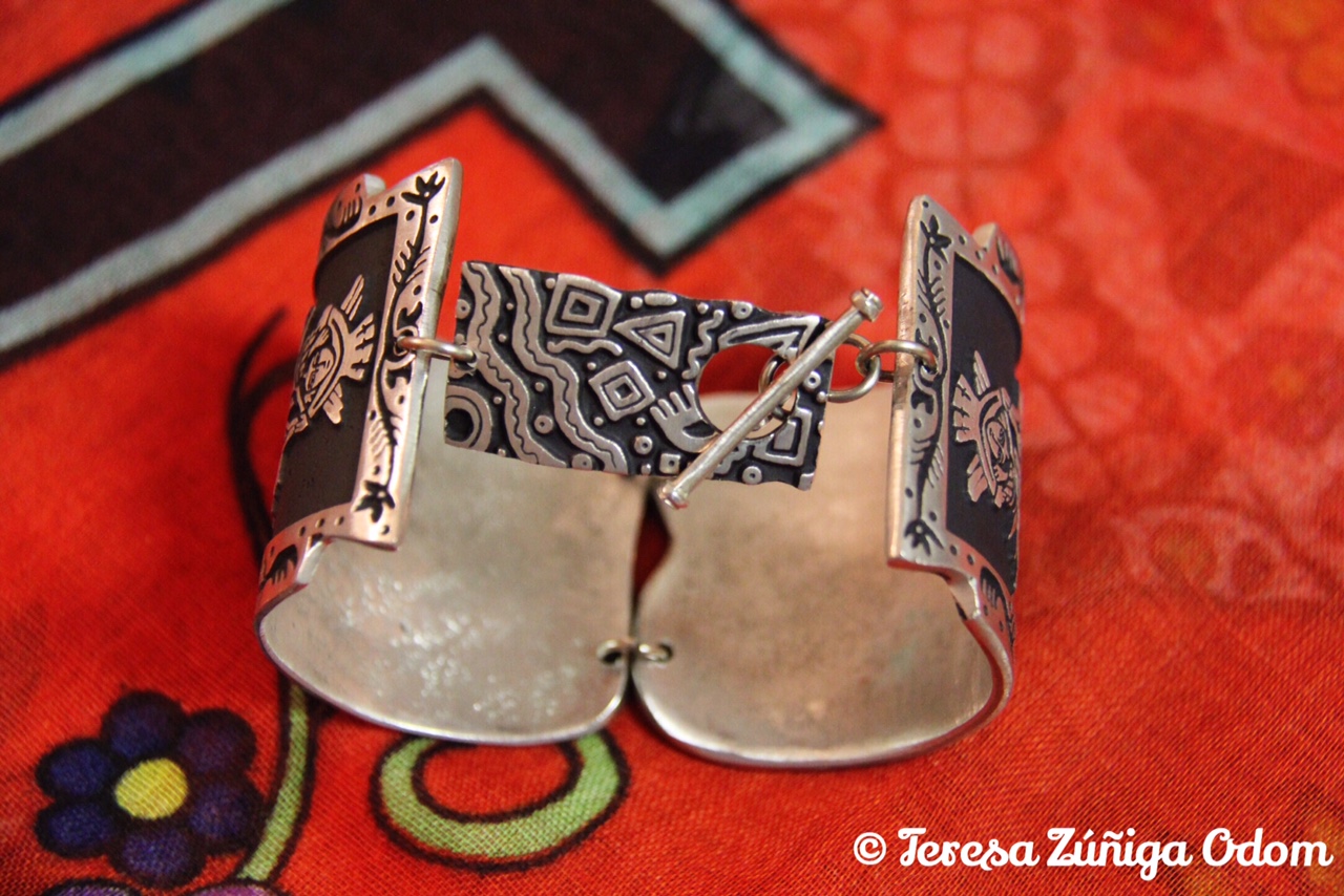 A few years ago, I found this beautiful and unusual Virgen de Guadalupe bracelet on my way back from a Zuniga family reunion in Albuquerque, New Mexico. It was made by artist Alice Seeley, the same artist who made the petroglyph pins I wrote about a few posts back. I didn’t buy the bracelet at the same time I bought the pins and so I was surprised that it was made by the same artist. It’s a heavy bracelet, made of pewter, and some might say its a little chunky. However, every time I wear it, it doesn’t weigh me down…it brings me comfort.