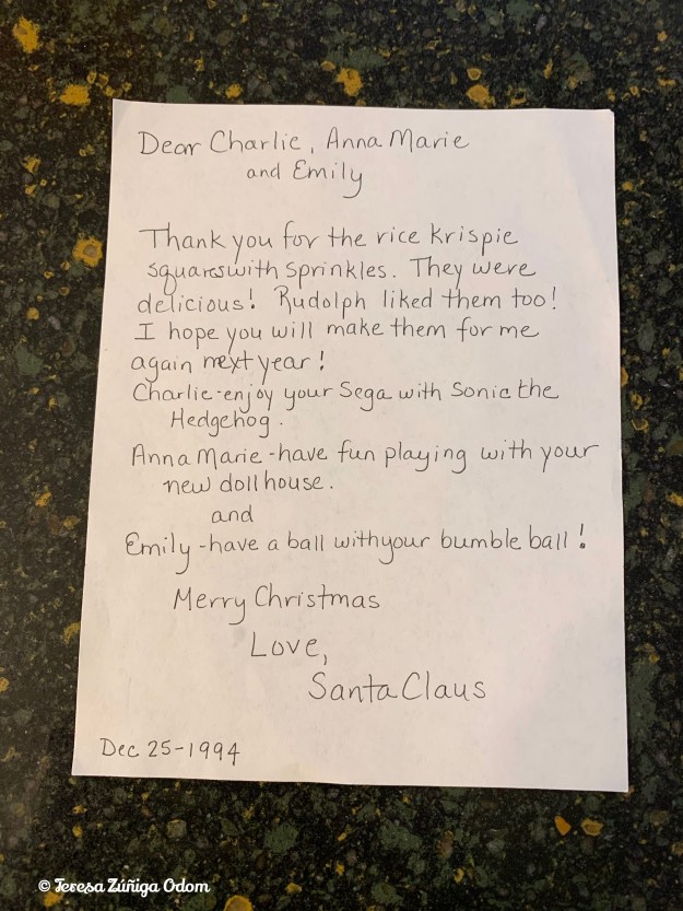The letters stopped after 2004. Emily was 10 years old and of course, Anna Marie (13) and Charlie (15) would write their letters to keep the tradition going for Emily’s sake. It was such a sweet thing for them to do. And “Santa” would always respond to each of them. It was actually an opportunity for their mother to interject a few things as though they were coming from Santa! But Santa’s last letter was to all three of my children together where he ended it by saying, “You Odom kids be good this coming year. This means helping more around the house, making good grades and always doing your best. I know you won’t let me down! Now…have a wonderful Christmas vacation! And don’t forget that I’ll be watching!
