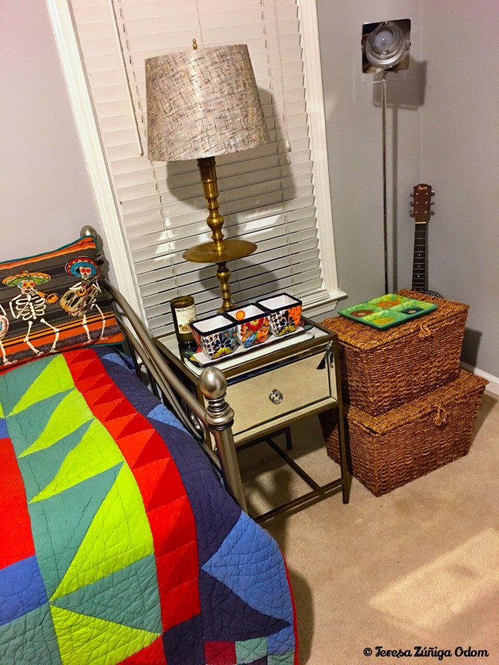 A better look at my grandmother’s lamp and the mirrored end table I found at the thrift store. The two baskets are filled with paperwork that I’ve saved. Another project to tackle!
