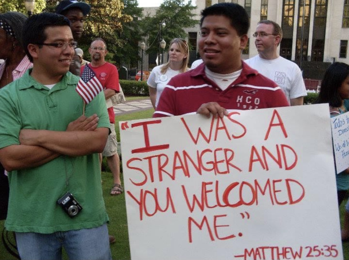 And then, as I looked closer at this photo, I realized I knew the other young man in the photo…it was Abe’s brother Frank! Frank Francisco had been a Fiesta Scholarship recipient in 2008 when he was attending University of Alabama at Birmingham and studying optometry. I remember him to well because he had the best smile and was always so humble. In the photo, Frank is holding a small American flag and looking at his brother Abe, who is holding a sign that said, “I was a stranger and you welcomed me.”