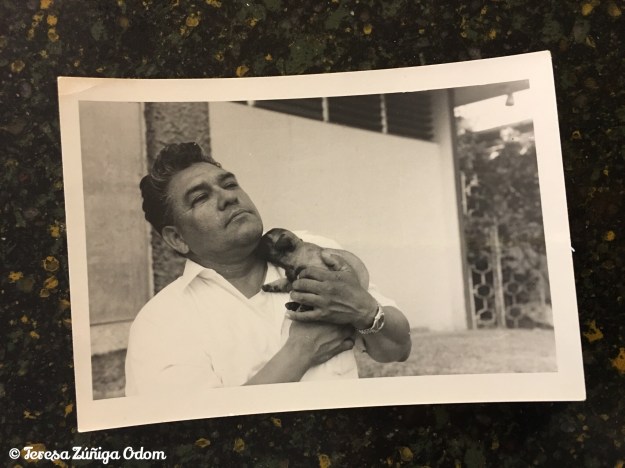 This photo is of my dad after we got our new Pug puppy, Tai Tai…you can see the wrought iron gate in the background. This was the same one on the other side of the house next to our car port. This is how dad and I climbed onto the roof of the house.